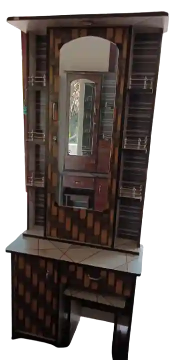 The Elite Modern Dressing Table from Sal Sabeel Shopping is a stylish and multi-functional vanity set designed to enhance your daily grooming experience with a blend of contemporary aesthetics and practical storage. This piece features a striking contrast of rich reddish-brown brick patterns and elegant marble-finish accents, centered around a high-clarity vertical mirror and a dedicated display area with stainless steel safety rails.